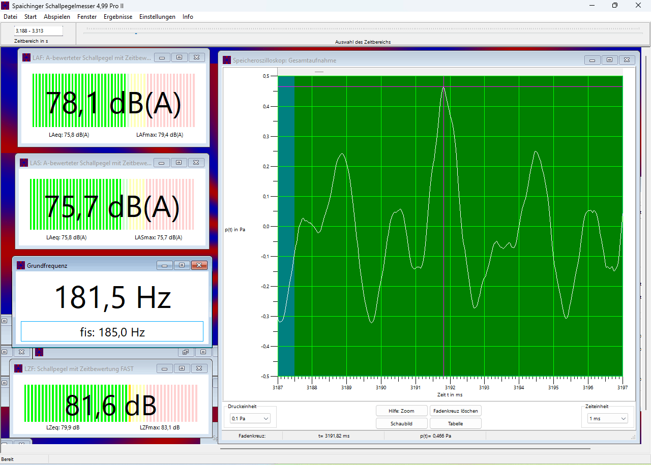 Die Software braucht nicht installiert zu werden, d. h., sie kann sogar von jedem USB-Stick aus betrieben werden (portable Software). Alle Messungen werden in Echtzeit durchgeführt und ausgegeben. Die einzelnen Messwerte werden automatisch in einer CSV-Tabelle gesammelt und abgespeichert. Dadurch können Sie auch Langzeitmessungen an Straßen und Arbeitsplätzen durchführen und diese später auswerten. Der Schalldruck (in Abhängigkeit von der Zeit) und das Spektrum können Sie ebenfalls in Form von Tabellen (CSV-Dateien) speichern, um sie anschließend in Excel oder ähnlichen Programmen zu bearbeiten. Dies ist zum Beispiel nützlich, um das Spektrum von verschiedenen Musikinstrumenten oder Stimmen miteinander zu vergleichen. Zum Analysieren oder Stimmen von Musikinstrumenten ist zusätzlich die von der Software mit großer Genauigkeit (+-0,2 Hz) bestimmte Grundfrequenz eines Klanges hilfreich. Die Schaubilder (Schalldruck, FFT-Spektrum und Terzspektrum) können Sie als Bild-Dateien (JPEG) abspeichern. Die Farben von Hintergrund, Gitter und Kurve können Sie vorher beliebig ändern. Dies ist für die Anfertigung von Präsentationen, Protokollen und Klassenarbeiten hilfreich. Mit dieser Software können Sie auch Wave-Dateien aufnehmen und abspielen. Bei der Aufnahme und beim Abspielen werden alle Messwerte und Schaubilder in Echtzeit ausgegeben. So können Sie früher gemachte (kurze) Aufnahmen auch später detailliert analysieren. Zusätzlich kann mithilfe eines Schiebereglers die aufgenommene Wave-Datei manuell analysiert werden, d. h., mit dem Schieberegler können Sie den aktuell angezeigten Zeitbereich beliebig wählen, die dazugehörigen Messwerte und Schaubilder werden dann automatisch angezeigt. Darüber hinaus können Sie mit dieser Software MP3-Dateien öffnen und analysieren. Die Software kann auch als optische "Lärmampel" verwendet werden. Der rote und der gelbe Bereich können vom Anwender beliebig eingestellt werden.