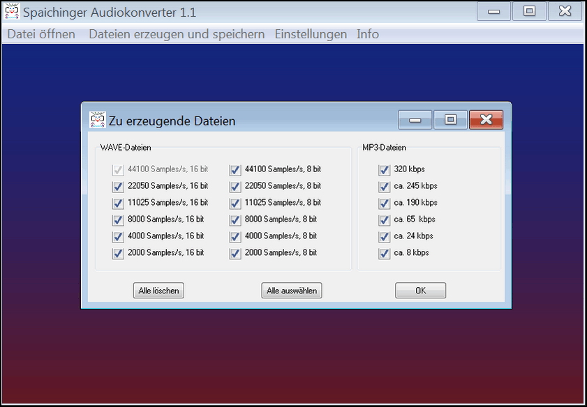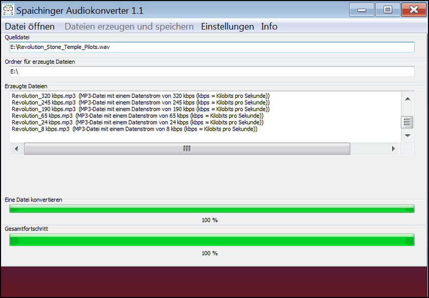 Mit der kostenlosen, werbefreien und datenschutzkonformen Software Spaichinger Audiokonverter könne Sie ein Musikstück von einer Audio-CD oder eine Audio-Datei ( WAVE- oder MP3-Format) in eine Vielzahl von WAVE- und MP3-Formate gleichzeitig umwandeln. D.h., Sie wählen unter dem Menü “Datei öffnen” ein Musikstück aus, anschließend wählen Sie im Menü “Einstellungen” die WAVE- und MP3-Formate aus , in denen Sie das Musikstück speichern wollen. Danach betätigen Sie “Datei erzeugen und speichern”. Dort wählen Sie ein Verzeichnis aus und geben einen Namen ein, unter dem die verschiedenen Versionen des Musikstück gespeichert werden sollen. Bestätigen Sie dies mit “Speichern”. Nun erzeugt das Programm die gewünschten Audio-Dateien. Zur Unterscheidung der Dateien hängt das Programm an den von Ihnen vorgegeben Namen die Bezeichnung des jeweiligen Audioformats an. Diese Software wird im Unterricht eingesetzt, um die Qualität der verschiedenen Audioformate zu untersuchen (siehe Experimentieranleitung).