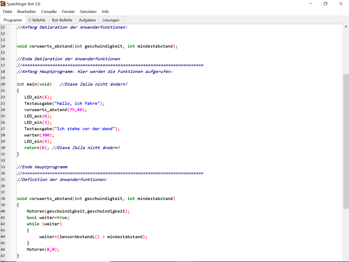 Unter dem Reiter „C-Befehle“ findet man alle notwendigen Befehle der Programmiersprache C. Unter dem Reiter „Bot-Befehle“ befinden sich die Befehle für die Ansteuerung der Aktoren und Sensoren des Bots.