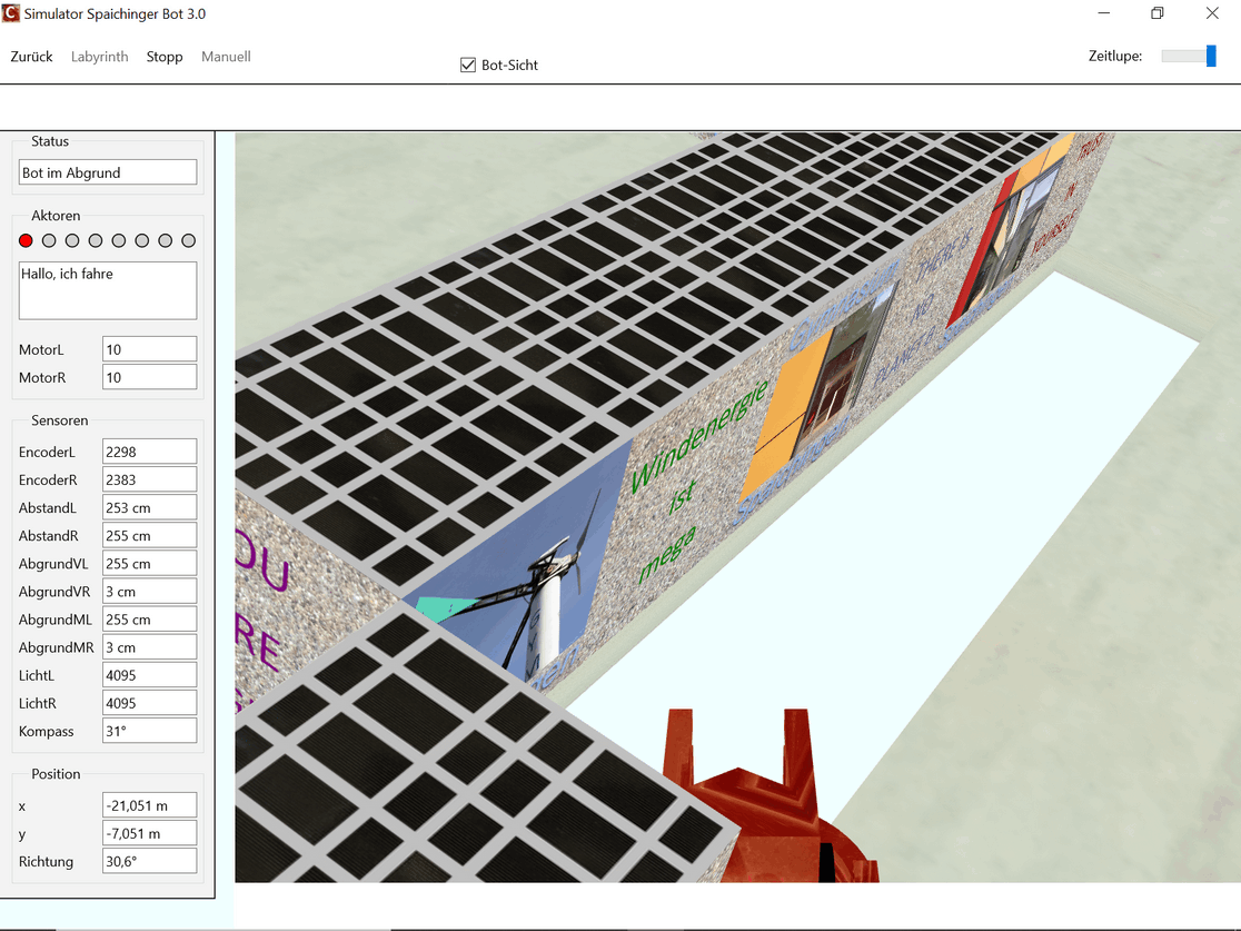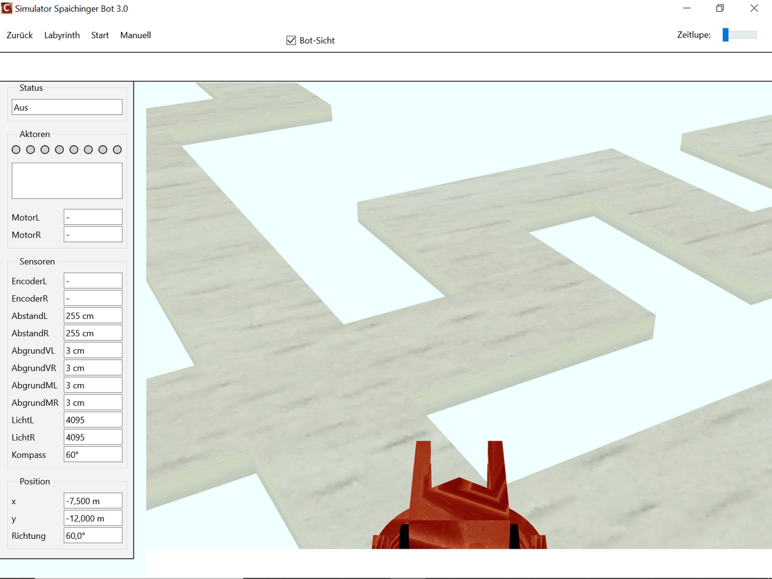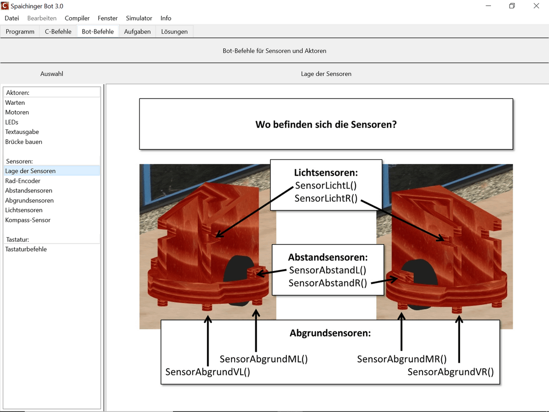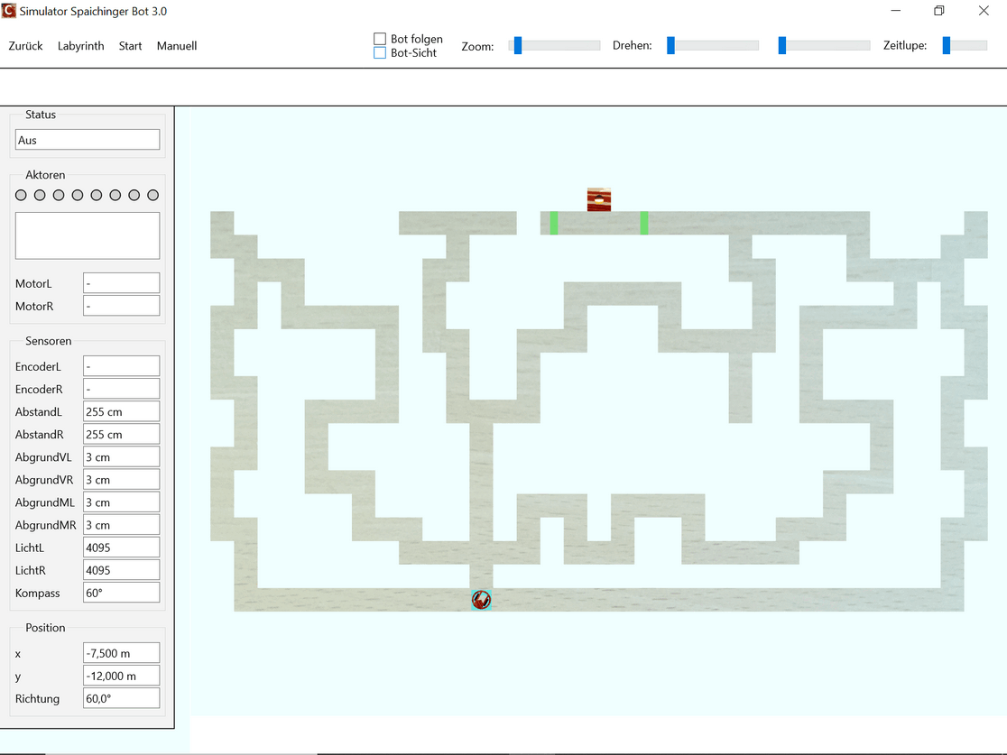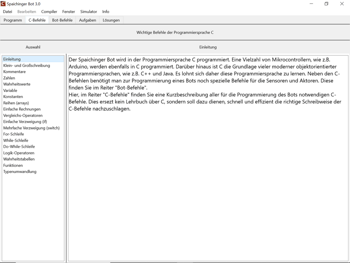 Die kostenlose, werbefreie und datenschutzkonforme Software Spaichinger Bot umfasst eine Entwicklungsumgebung mit Simulator. Sie ist ideal geeignet zum spielerischen Erlernen der Programmierspache C im Kontext der Programmierung eines Fahrroboters "Bot". Hierzu wird kein realer Bot benötigt, da das Verhalten des Roboters beim Durchfahren von 9 verschiedenen Labyrinthen simuliert wird. Der Roboter muss hierbei nicht nur durch die Labyrinthe hindurchfinden, sondern auch darauf achten, dass er in kein “Loch” hineinfällt. Am Ziel steht ein Licht. Vor diesem muss er dann anhalten. Zudem stehen 8 verschiedene Skywalks zur Auswahl. Bei einigen Labyrinthen und Skywalks befindet sich ein Graben um das Ziel. Um diesen Graben zu überwinden, kann der Bot eine Brücke bauen. Außerdem sind Labyrinthe mit „Inseln“ vorhanden. Zur Wahrnehmung seiner Umwelt stehen dem Roboter verschiedene Sensoren zur Verfügung:
