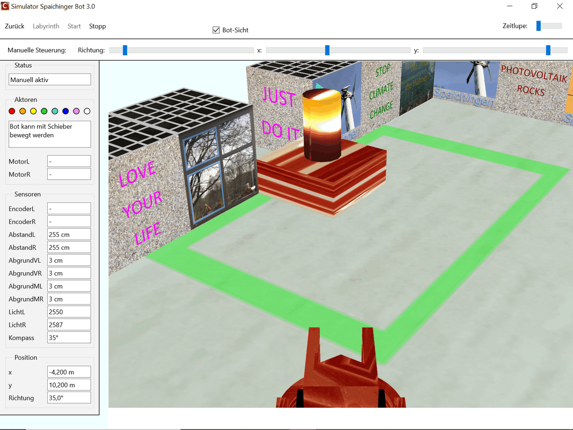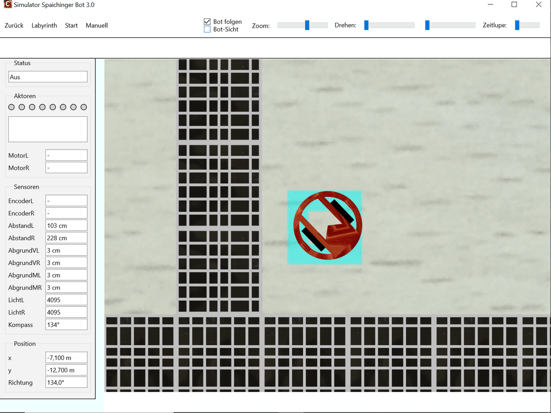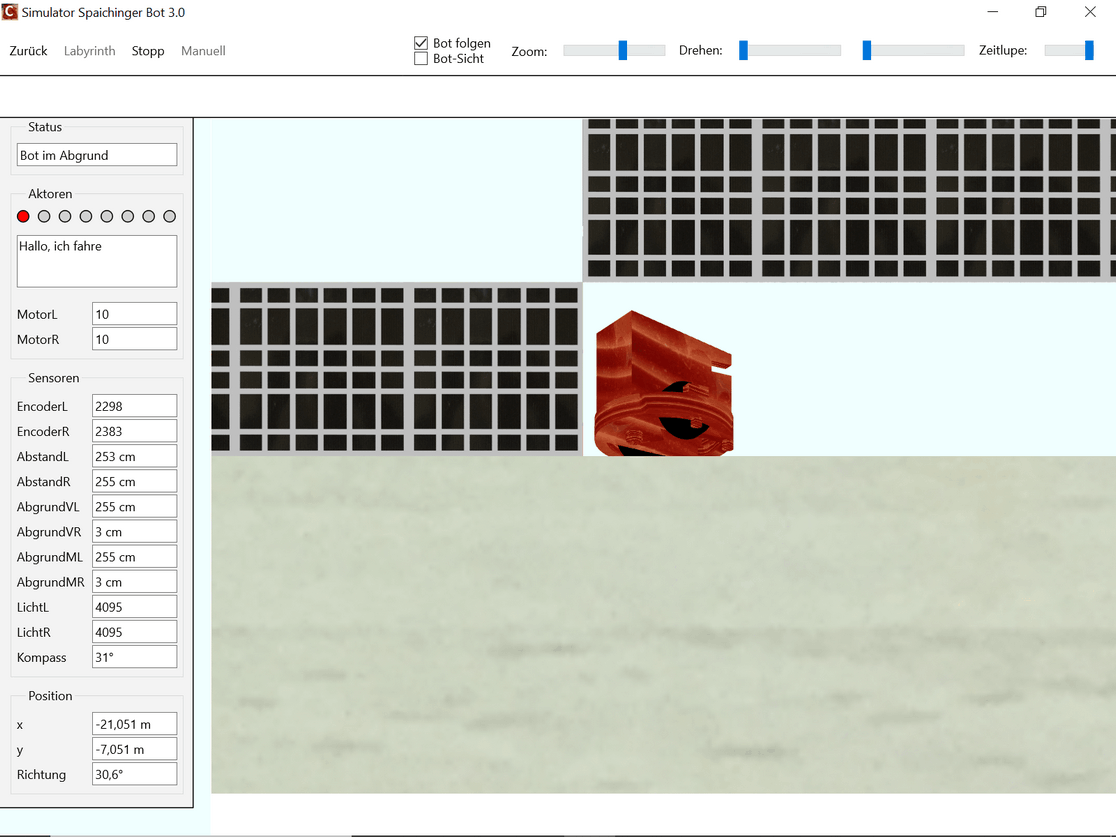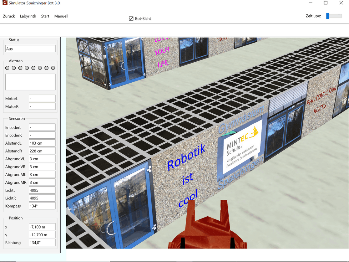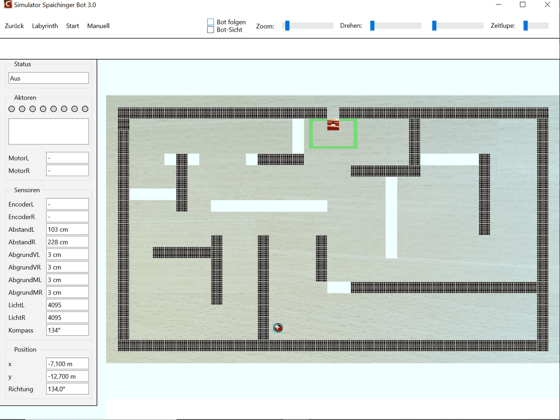Die kostenlose, werbefreie und datenschutzkonforme Software Spaichinger Bot umfasst eine Entwicklungsumgebung mit Simulator. Sie ist ideal geeignet zum spielerischen Erlernen der Programmierspache C im Kontext der Programmierung eines Fahrroboters "Bot". Hierzu wird kein realer Bot benötigt, da das Verhalten des Roboters beim Durchfahren von 9 verschiedenen Labyrinthen simuliert wird. Der Roboter muss hierbei nicht nur durch die Labyrinthe hindurchfinden, sondern auch darauf achten, dass er in kein “Loch” hineinfällt. Am Ziel steht ein Licht. Vor diesem muss er dann anhalten. Zudem stehen 8 verschiedene Skywalks zur Auswahl. Bei einigen Labyrinthen und Skywalks befindet sich ein Graben um das Ziel. Um diesen Graben zu überwinden, kann der Bot eine Brücke bauen. Außerdem sind Labyrinthe mit „Inseln“ vorhanden. Zur Wahrnehmung seiner Umwelt stehen dem Roboter verschiedene Sensoren zur Verfügung: