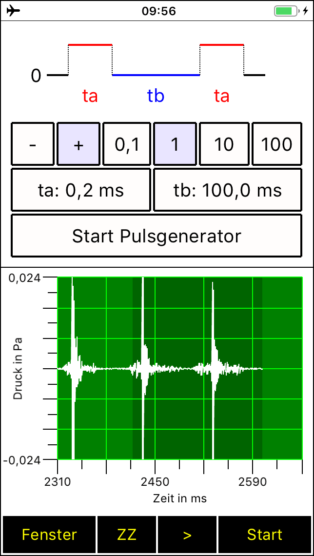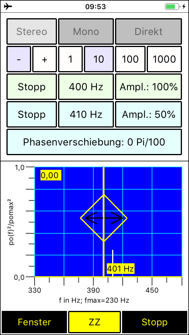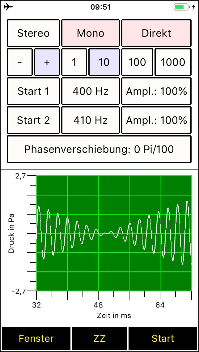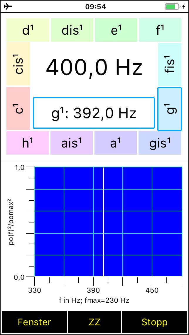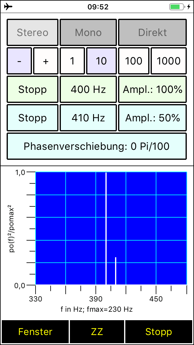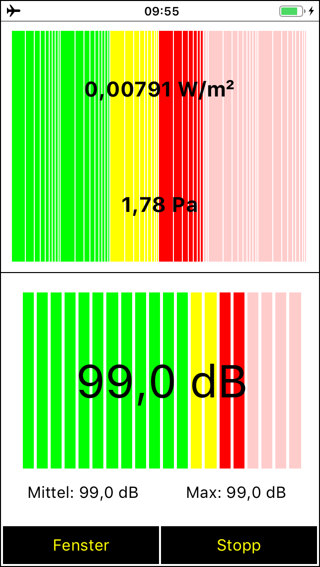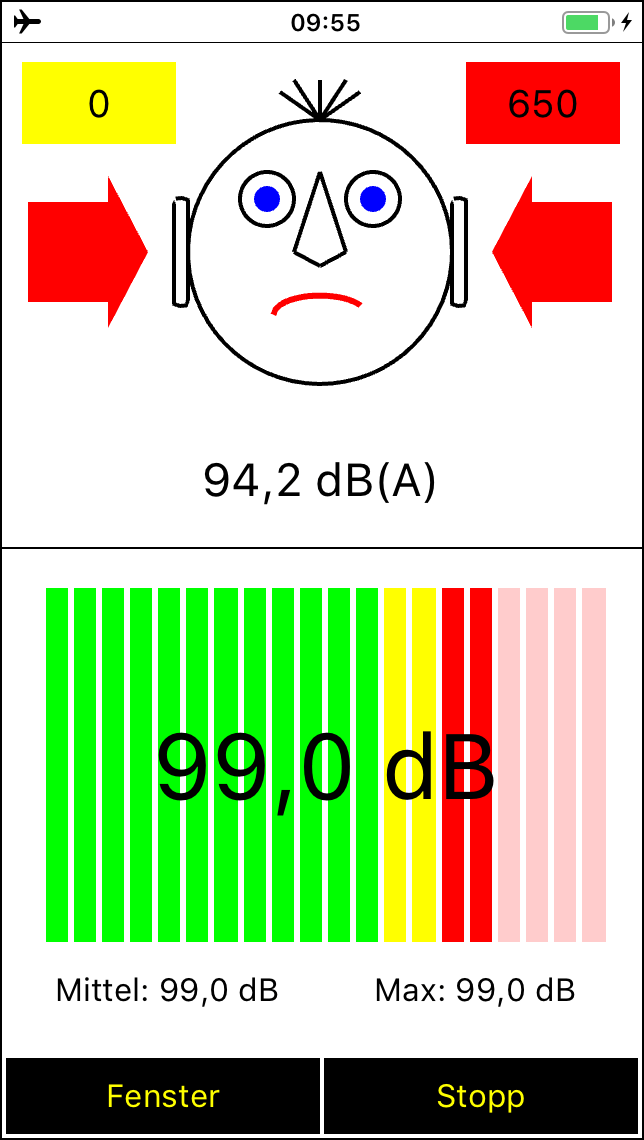 Seit Version 2.2 besitzt der Spaichinger Schallanalysator zudem einen Tongenerator mit dem bis zu 2 Töne gleichzeitig abgespielt werden können. Darüber hinaus können Schallpulse (Knackgeräusche) erzeugt werden, die für Schallgeschwindigkeitsmessungen hilfreich sind. Alle Messungen werden in Echtzeit durchgeführt und ausgegeben. Die einzelnen Messwerte und die Mittelwerte werden in einer Tabelle gesammelt, die als CSV-Datei abgespeichert werden kann. Dadurch können Sie auch Langzeitmessungen an Straßen und Arbeitsplätzen durchführen und diese später auswerten. Der Schalldruck (in Abhängigkeit von der Zeit) und das Spektrum können Sie ebenfalls in Form von Tabellen (CSV-Dateien) speichern, um sie anschließend in Excel oder ähnlichen Programmen zu bearbeiten. Dies ist zum Beispiel nützlich, um das Spektrum von verschiedenen Musikinstrumenten oder Stimmen miteinander zu vergleichen. Zum Analysieren oder Stimmen von Musikinstrumenten ist zusätzlich die von der App mit großer Genauigkeit bestimmte Grundfrequenz eines Klanges hilfreich. Mit dieser App können Sie auch Wave-Dateien aufnehmen und abspielen. Bei der Aufnahme und beim Abspielen werden alle Messwerte und Schaubilder in Echtzeit ausgegeben. So können Sie früher gemachte Aufnahmen auch später detailliert analysieren. Zusätzlich kann die aufgenommene Wave-Datei manuell analysiert werden, d. h., durch "Wischen" können Sie den aktuell angezeigten Zeitbereich beliebig wählen, die dazugehörigen Messwerte und Schaubilder werden dann automatisch angezeigt. Zudem können mithilfe der beigefügten Wave-Aufnahmen von Musikinstrumenten Untersuchungen zum Klang durchgeführt werden. In der Sammlung Musikinstrumente finden Sie ebenfalls den wunderbaren Obertongesang von Herrn Wolfgang Saus (www.oberton.de). Die App kann auch als optische "Lärmampel" verwendet werden (siehe obiges "Gesicht"). Der rote und der gelbe Bereich können vom Anwender beliebig eingestellt werden.