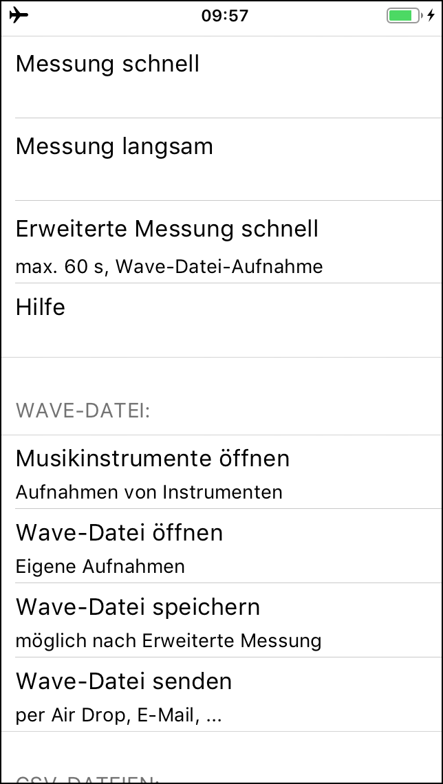 Für iOS: Ausnahme: Bei Betätigen der Buttons "Bedienungsanleitung", "Experimentieranleitungen" bzw. "Durchführung/Auswertung" startet der Standardbrowser und es werden PDF-Dokumente der Seite https://spaichinger-schallpegelmesser.de geladen.