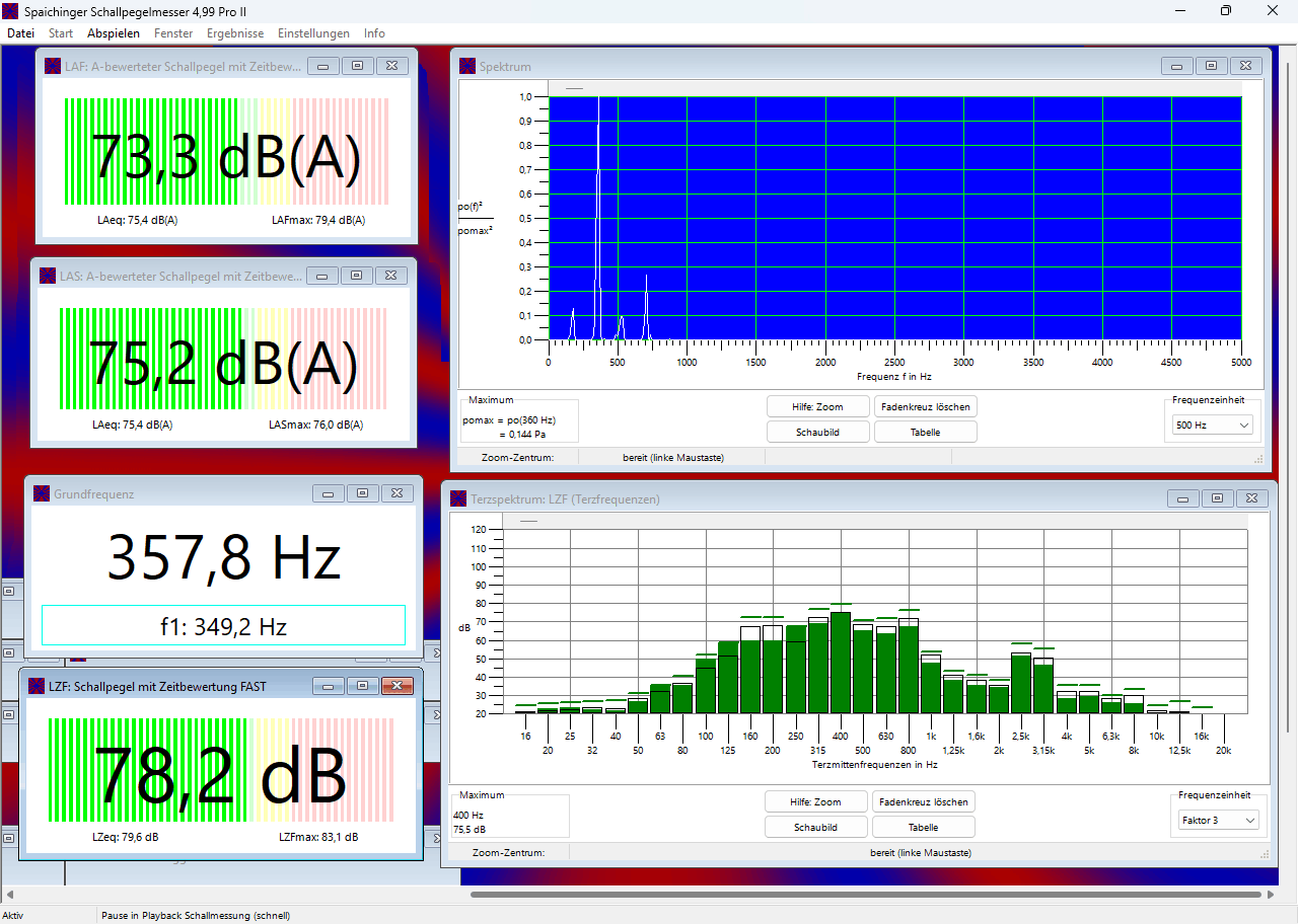 Die kostenlose, werbefreie und datenschutzkonforme Pro- und Pro-II-Versionen der Schallanalyse-Software Spaichinger Schallpegelmesser erlauben (seit Version 4.9) sehr präzise Schallanalyse- und Schallpegelmessungen und eine umfangreiche Auswahl von Schallmessgrößen, und sind damit auch für den professionellen Einsatz bestens geeignet. Die Software erfüllt und übertrifft die Genauigkeits-Anforderungen der gültigen Norm DIN EN 61672-1-2014 für Klasse-1-Schallpegelmesser. Das Terzspektrum der Pro-II-Version erfüllt zudem die Genauigkeitsanforderungen der gültigen Norm DIN EN 61260-1 für Klasse-1-Terzfilter. Falls Sie einen PC (mit Betriebssystem Windows 10 oder Windows 11) und ein Klasse-1-Messmikrofon besitzen, dann erhalten Sie mit dieser Software einen hochwertigen Klasse-1-Schallpegelmesser. Die Kombination aus Spaichinger Schallpegelmesser Pro/Pro II und einem Messmikrofon ist preislich ebenfalls sehr interessant, da es Klasse-1-Messmikrofone bereits ab 114 € (z.B. UMIK-1 von miniDSP) gibt. Ein käufliches Klasse-1-Schallpegelmessgerät kostet hingegen ca. 1500 €. Die Pro- und Pro-II-Version ist bisher ausschließlich für PCs und Tablets mit dem Betriebssystem Microsoft Windows (10 und 11) erhältlich. Beachten Sie bitte unbedingt die Installationshinweise.